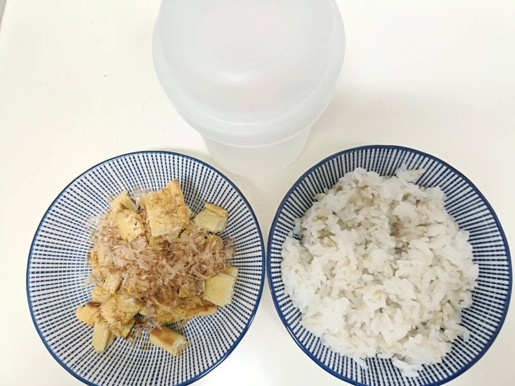 油揚げはトースターで焼いて、醤油と鰹節をかけた。冷凍しておいたもち麦ご飯をチンする。