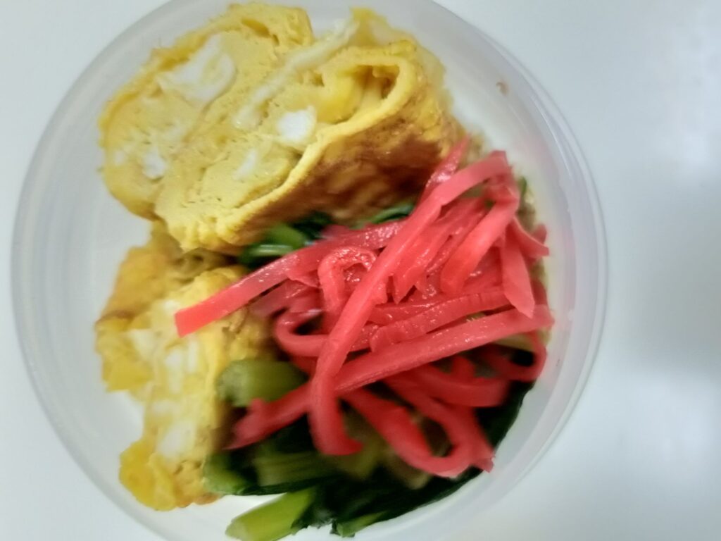 卵焼きと作り置きの小松菜炒め、紅生姜を添えれば、彩りの良い弁当完成。